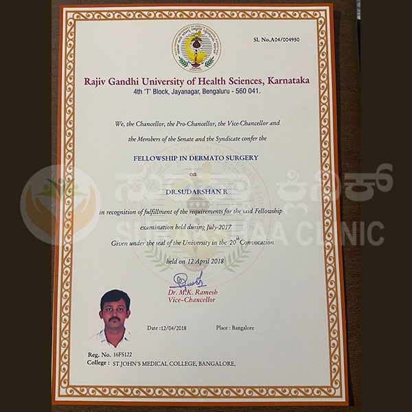 Completed 1year fellowship in DERMATOSURGERY, recognized by rajiv Gandhi university of health sciences